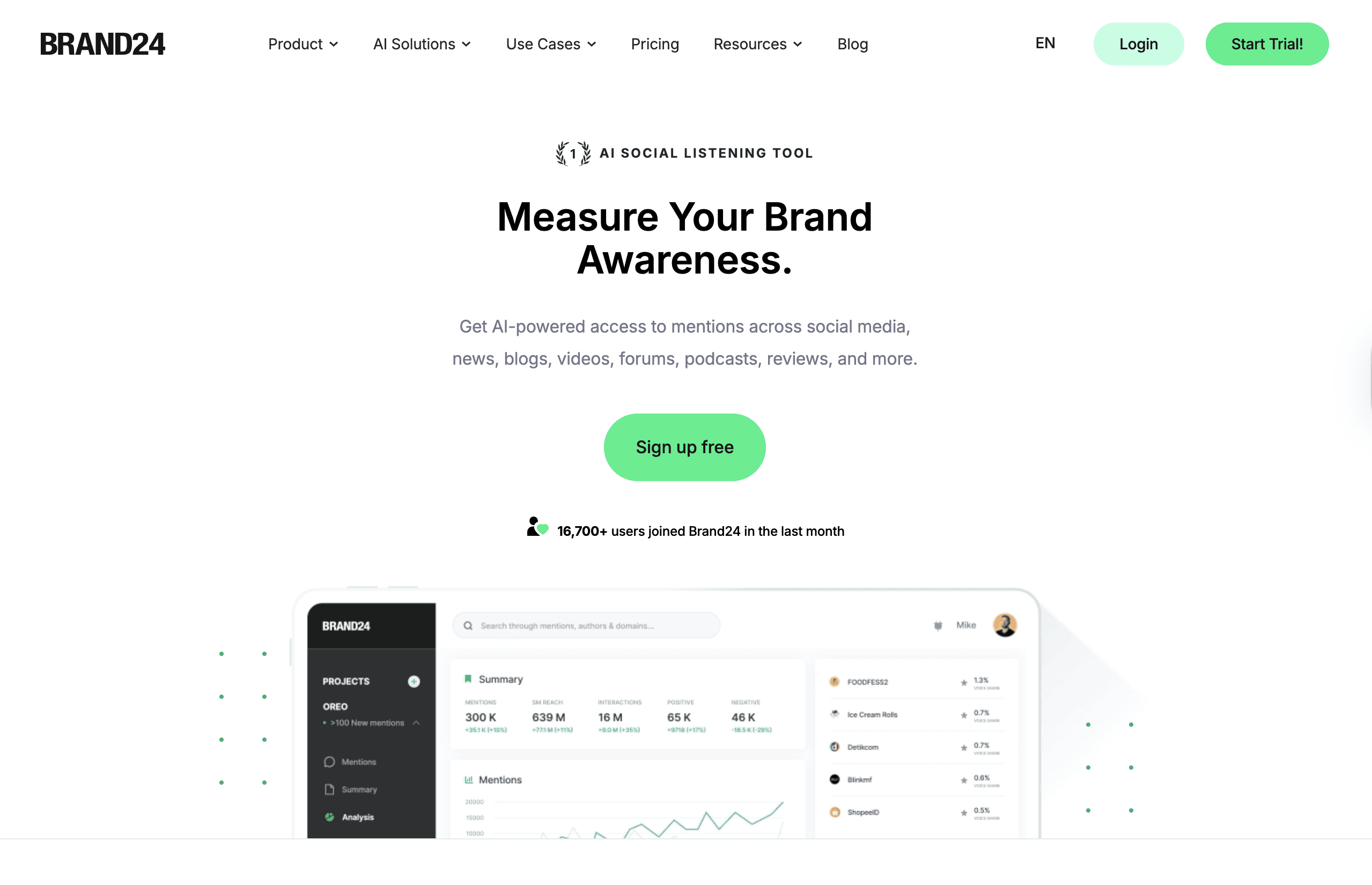 Brand24 tracks keyword mentions across social media, blogs, forums, and selected review sites. It provides real-time alerts, sentiment analysis, and historical data, helping teams stay aware of shifts in public discussion. For many brands, Brand24 serves as a practical step up from basic monitoring tools, offering structured insights without the complexity of enterprise platforms.