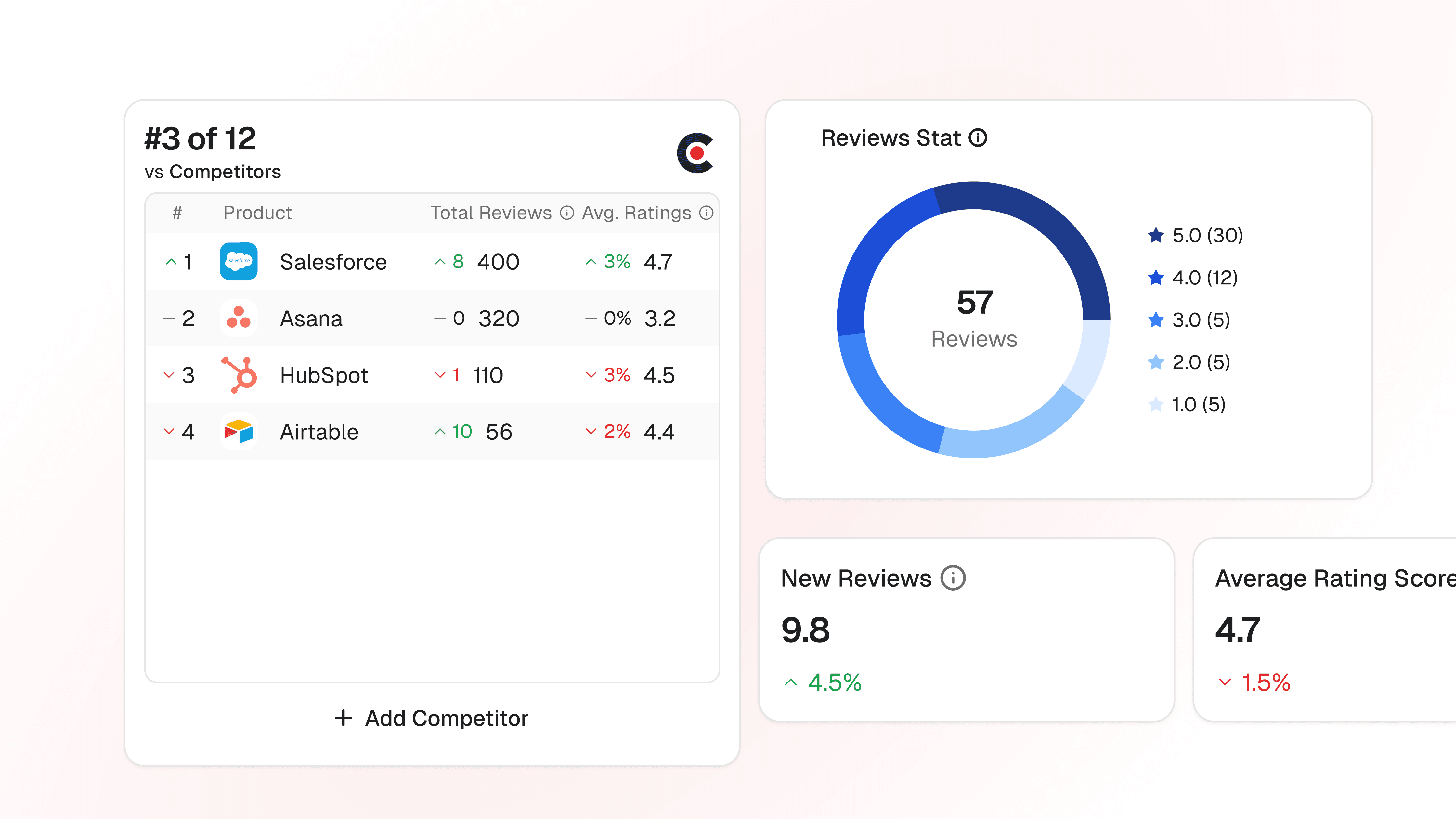 Benchmark against competitors by comparing ratings, badges, and review volume trends